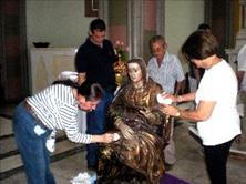 SANTA ANA. La imagen de la patrona de la ciudad, Señora Santa Ana, fue bajada ayer del altar mayor de la iglesia Catedral con el objetivo de limpiarla e instalarla en un altar temporal donde los feligreses puedan venerarla antes y durante los festejos patronales, que se celebran del 17 al 26 de julio.