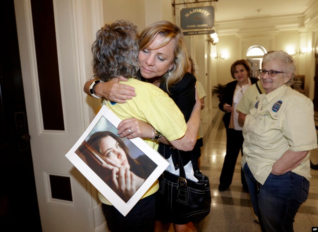 Debbie Ziegler sujeta la foto de su hija Brittany Maynard, quien tuvo que mudarse a Oregon para recibir ayuda para terminar con su vida. Brittany tenía cáncer terminal.