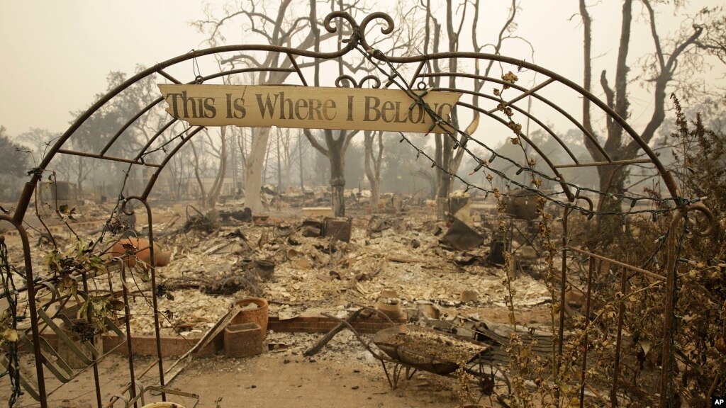 Un rótulo a la entrada de una casa destruida por las llamas en Middletown, California lee «Aquí es donde pertenezco».