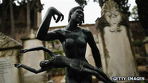 En una de las lápidas se erige una escultura de un ángel semidesnudo, tan alto como un hombre y con alas de piedra que se levantan por encima de su cabeza.
