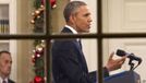 El presidente Obama visto a través de una ventana mientras se dirige a la nación de la Oficina Oval de la Casa Blanca.
