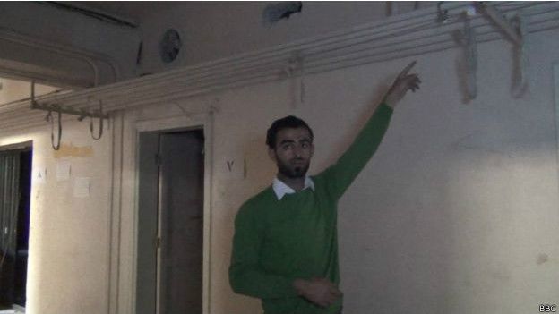 Image captionMilad Al-Shihaby muestra de donde colgaban a sus compañeros de celda.