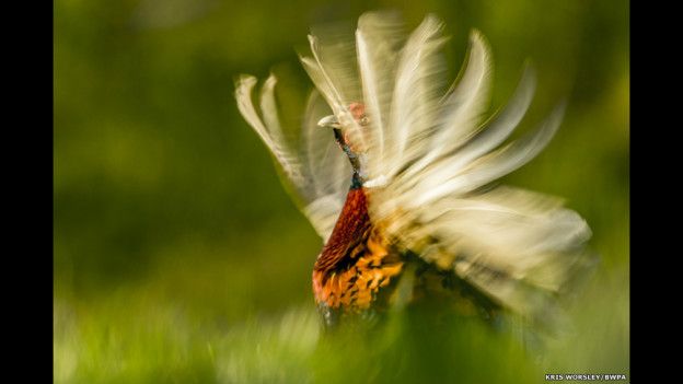 Kris Worsley capturó el momento exacto en que un faisán agita las plumas de su cola en señal de tirunfo.