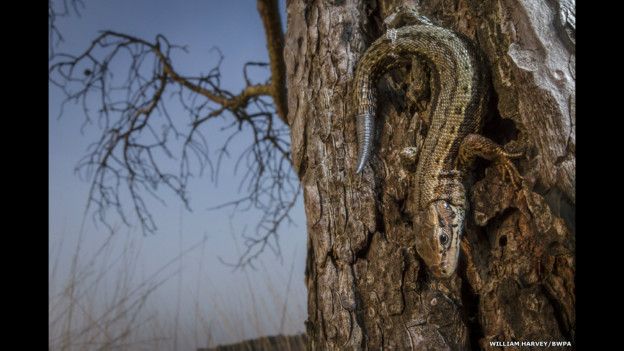 Esta foto de una lagartija común sobre un arbol en Surrey, en el sur de Inglaterra, tomada por William Harvey, se llevó el primer lugar en la categoría retrato de animales.