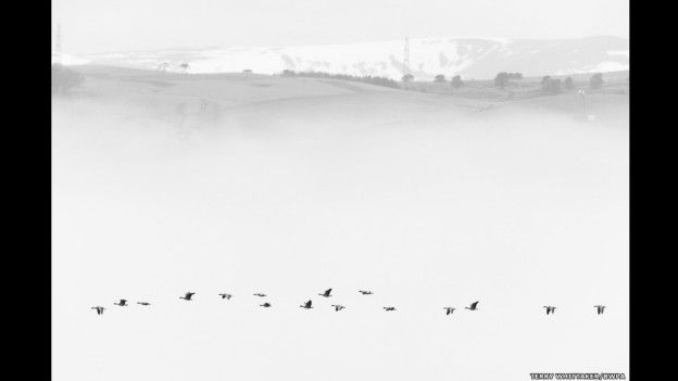 Terry Whittaker ganó el premio en la categoría de naturaleza británica en blanco y negro con esta imagen de una bandada de gansos de pies rosas sobrevolando la isla Negra, en las tierras altas de Escocia, en medio de la neblina.