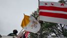 Un trabajador municipal coloca banderas del Vaticano, EE.UU. y el Distrito de Columbia en la avenida Pennsylvania por donde pasará la caravana papal.