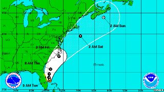 Los pronósticos apuntan a que la tormenta avance hacia el norte el miércoles por la noche, tocando primero las Carolinas y luego de fortalecerse, pase frente a las costas de Virginia, cerca de Washington, el viernes. Hay alguna probabilidad de que la tormenta adquiera fuerza de huracán categoría 1.