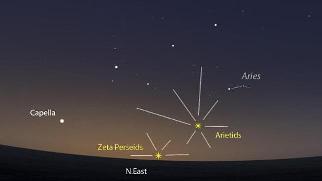 El día 7 es el día grande de las lluvias de meteoros en junio y nos encontraremos con dos lluvias; las Ariétidas y las Zeta Perséidas. La Luna se encontrará en fase creciente y se ocultará poco más allá de las 2.30 de la madrugada. Las Ariétidas es la lluvia más importante de junio, caen a un ritmo de 66 meteoros por hora y con una velocidad moderada de 39 km/s se contemplarán mejor, mirando hacia la constelación de Aries. Es una de las lluvias más importantes del año, ya que se llegan a contabilizar entre 50 y 80 meteoros por hora. El mejor instante para verlas, es antes del amanecer que es cuando hace su aparición la constelación de Aries, mirando al NE, que para esa noche aparecerá sobre las 4 de la madrugada, después de haberse puesto la Luna, por lo que el cielo estará completamente a oscuras. No se sabe con certeza qué objeto es el que provoca la lluvia, aunque los astrónomos están divididos entre el asteroide 1566 Icarus y el cometa 96 P/Machholz.
