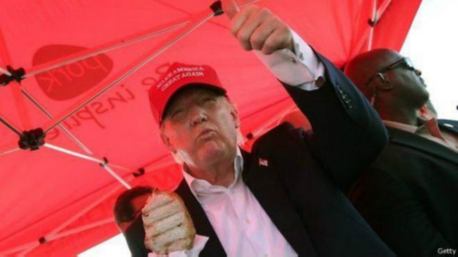 El polémico Donald Trump, entre otros candidatos, cumple con el ritual de probar las delicias de la feria de Iowa.