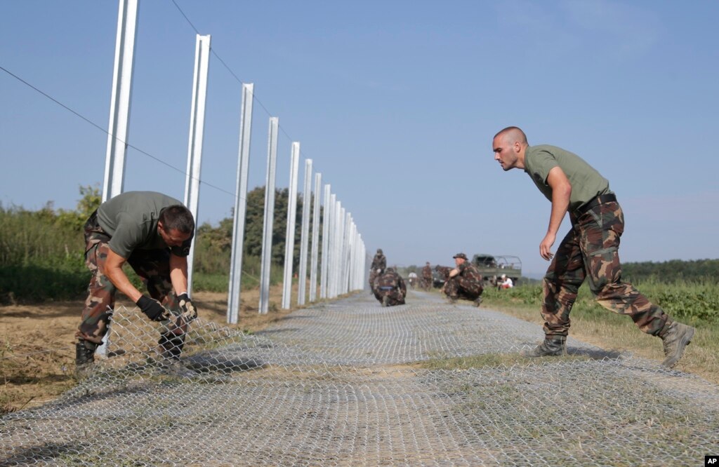 Soldados húngaros trabajan para construir una valla en la frontera con Croacia, el martes, 22 de septiembre de 2015.