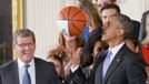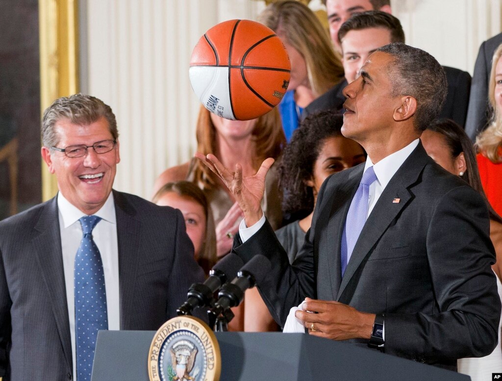 El presidente rindió homenaje a las campeonas universitarias por haber obtenido su tercer título nacional. La Universidad de Connecticut ganó el campeonato universitario de basquetbol femenino en abril cuando derrotó a la Universidad Notre Dame 63-53.  La victoria les otorgó el décimo título nacional.