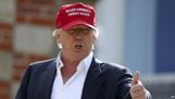 Donald Trump habla conlos periodistas luego de llegar en helicóptero al Abierto Británico de Golf, en Escocia. El letrero en su gorra lee: «Hagamos a Estados Unidos grande de nuevo».