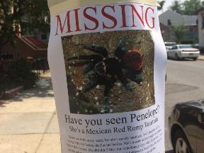 El barrio neoyorquino de Park Slope, en Brooklyn, se levantó hoy lleno de carteles que buscan a Penélope, una tarántula mexicana de vientre rojo que se ha perdido y que, además, puede colonizar la barriada con sus pequeñas arañas, pues está embarazada, informa el New York Post.