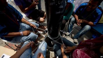 Jóvenes se encadenas en las afueras de las oficinas de Naciones Unidas en Caracas, en abril de 2014.