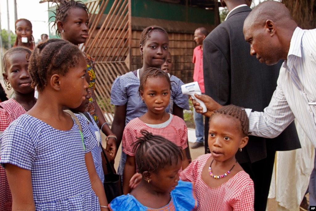 Un trabajador de la salud toma la temperatura a escolares en busca de síntomas de ébola, antes de que ingrersen a clase, en Conakry, Guinea.Un trabajador de la salud toma la temperatura a escolares en busca de síntomas de ébola, antes de que ingrersen a clase, en Conakry, Guinea.