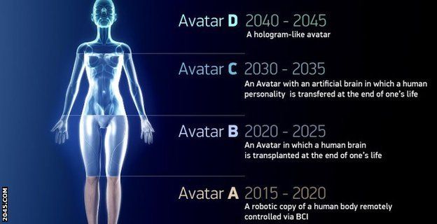 Según el proyecto 2045 Initiative, en los próximos 30 años se podrán crear tecnologías «capaces de transferir la personalidad de un individuo a un cuerpo no biológico mucho más avanzado, que permitirá extender la vida, alcanzando el punto de inmortalidad».